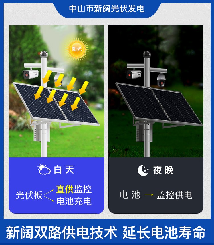 新闊雙路供電技術,白天太陽能板直接給監控供電,多余電量存進電池,減少電池循環次數,電池延長壽命。